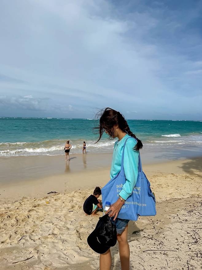 여기에 어깨에 멘 시원한 하늘색 에코백은 상의와 톤온톤 조화를 이루며 해변의 여유로운 감성을 완성하는 영리한 포인트가 됩니다.