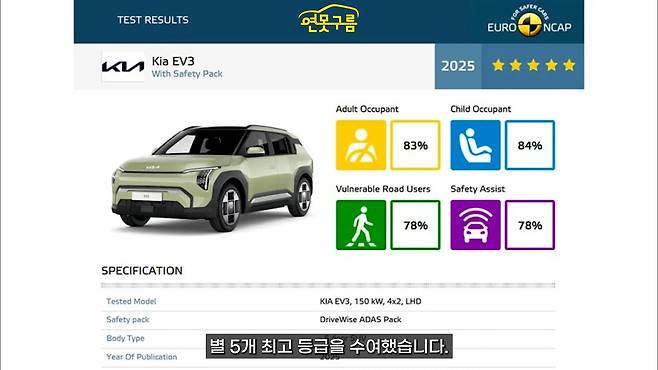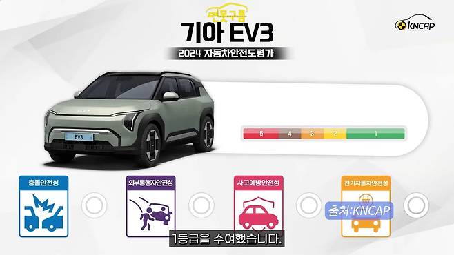 최근 전기차 SUV 시장에서 돌풍을 일으키고 있는 기아 EV3가 국내 충돌 테스트 기관인 KNCAP(한국자동차안전도평가)에서 최고 등급인 1등급을 획득했다고 발표됐다. 중형이나 대형도 아닌 소형급 차량으로는 이례적인 결과로 업계의 주목을 받고 있다.