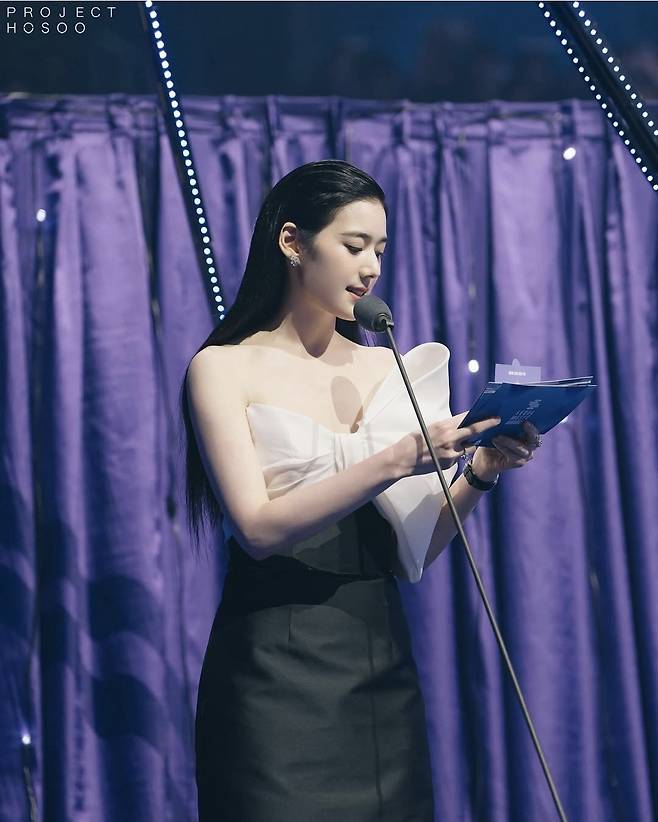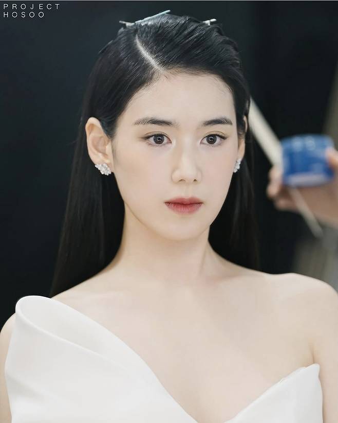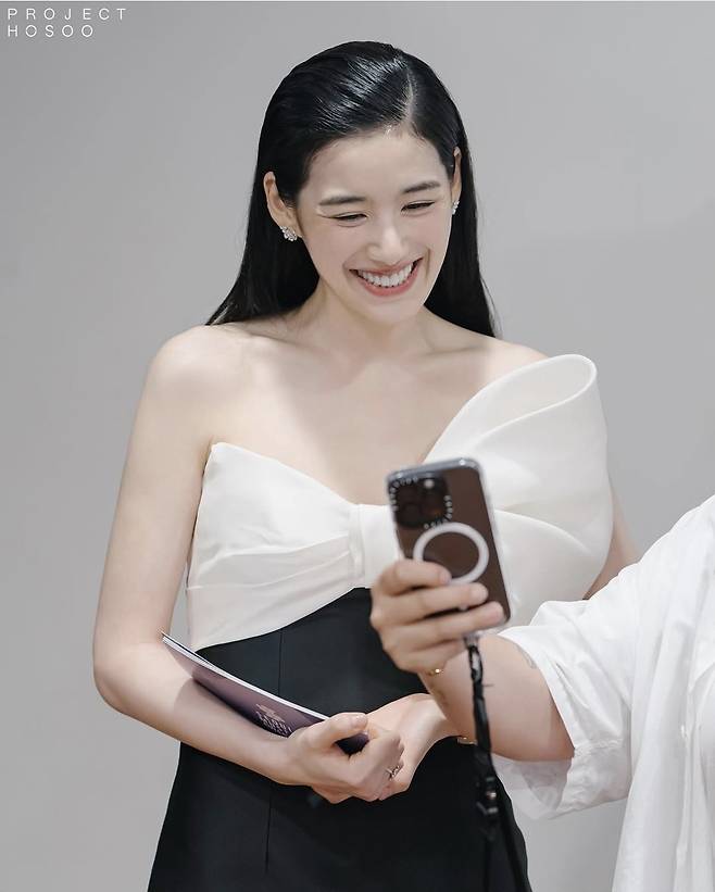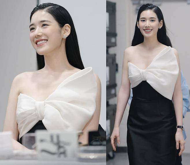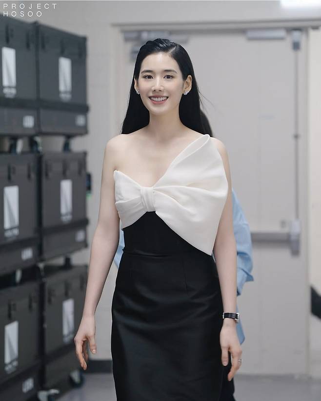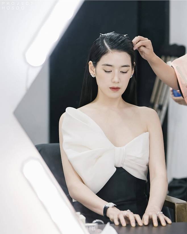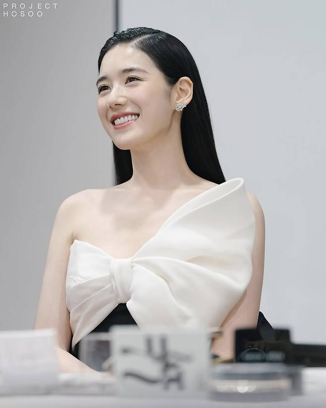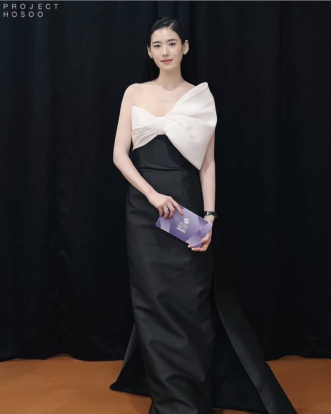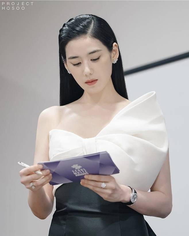 정은채는 화이트 리본 디테일이 돋보이는 비대칭 오프숄더 드레스로 단아하면서도 구조적인 포인트를 살렸습니다.
