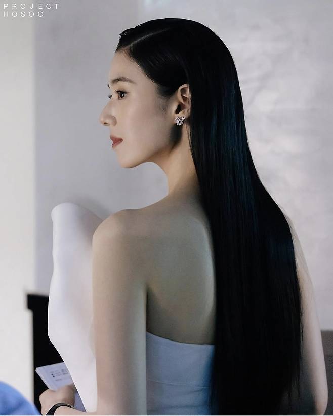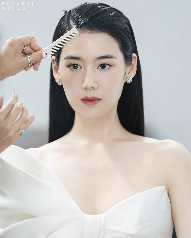 매끈한 스트레이트 헤어와 은은한 메이크업은 전체적인 룩에 고급스러운 정적 분위기를 더했으며, 정은채 특유의 도회적 이미지와 조화를 이루는 절제된 포멀룩이었습니다.