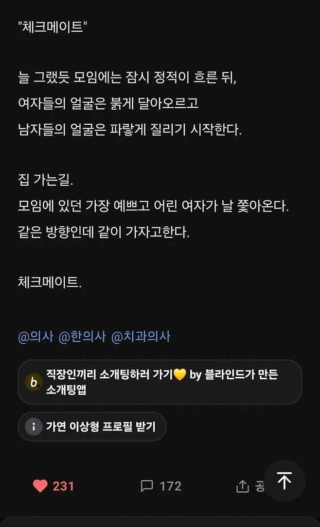 그리고 소개팅이 끝나고 집에 가는 길에 가장 예쁘고 어린 여자가 쫓아오며, “같은 방향인데 같이 가자”라고 제안한다는 것이다.