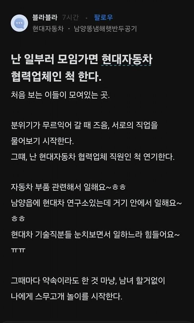 블라인드에 현대차 직원임을 인증한 그가 올린 글을 보면, 그는 소개팅 자리에서 일부러 자신이 다니는 회사 이름을 밝히지 않는다고 한다.