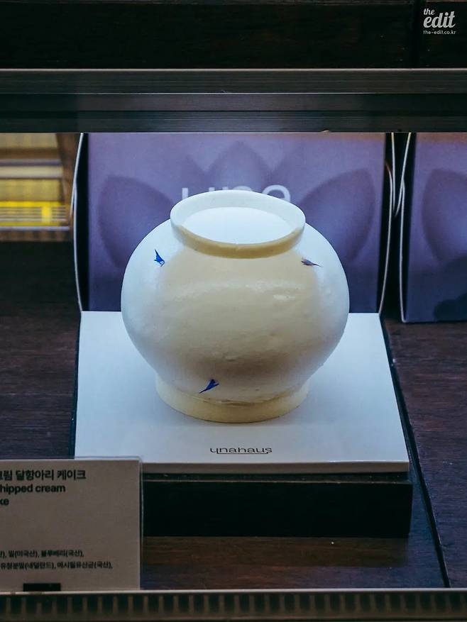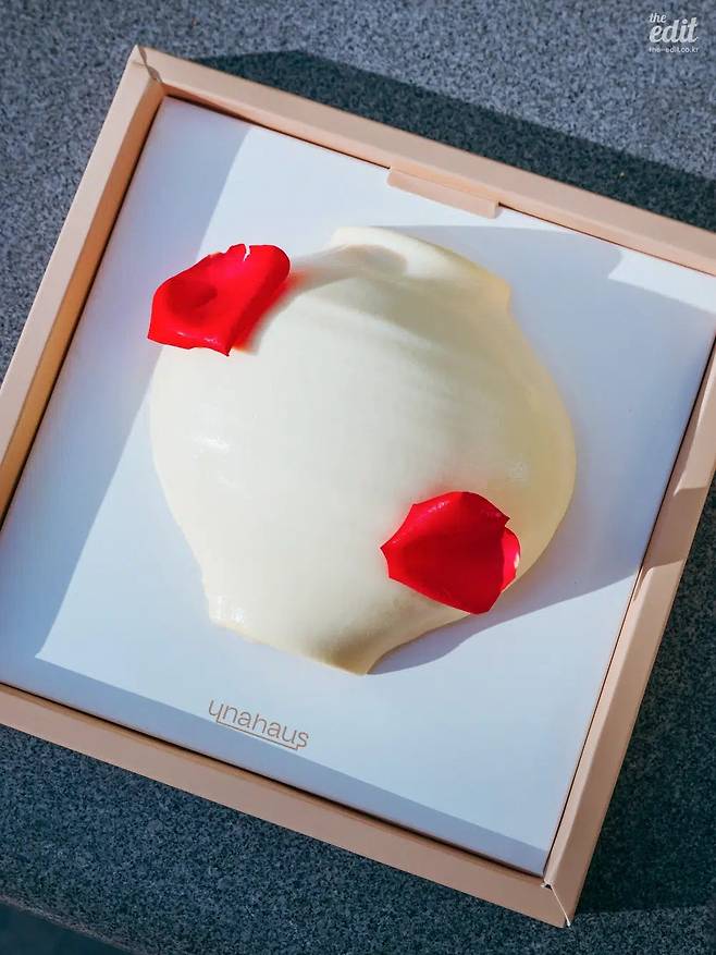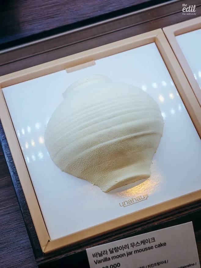 우나스의 세컨드 브랜드로 더 현대 서울, 현대 백화점 압구정점과 무역센터점 총 세 곳에 지점이 있다. 한 번 보면 잊을 수 없는 달항아리 모양 케이크가 이곳의 시그니처다. 실제 달항아리라고 착각할 수 있을 만큼 섬세하고 아름다운 형태와 더불어 누구나 좋아할 만한 균형 잡힌 맛을 담고 있다. 생크림과 제철 과일로 이루어진 케이크라 여럿이 나눠 먹기에 부담 없지만, 조금 더 가벼운 스타일을 원한다면 달항아리 액자 무스케이크를 추천한다. 액자 속에 입체적으로 담긴 형태로 마치 단아한 예술 작품을 감상하는 듯하다. 현재는 바닐라, 유자, 이스파한 세 가지 종류가 있는데 꽃 향을 좋아한다면 ‘이스파한’을 추천하고 싶다. 화사한 향을 담은 장미 리치 무스와 라즈베리 리치 꿀리, 리치 과육, 장미 시럽에 적신 시트가 매력적인 하모니를 이룬다.
