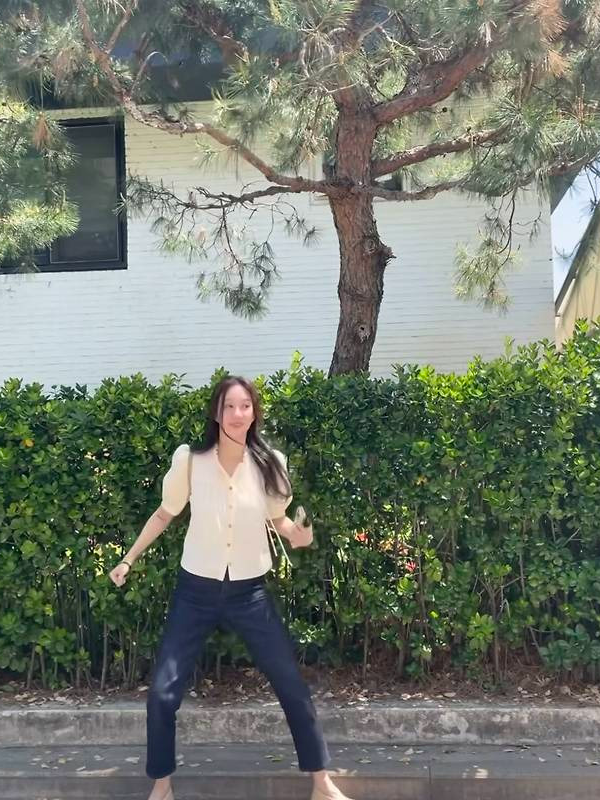 블라우스의 은은한 셔링 디테일은 소녀감성을 살려주는 동시에 성숙한 분위기를 더했고, 여기에 단정한 스트레이트 데님 팬츠를 더해 클래식하면서도 트렌디한 무드를 연출했습니다.
