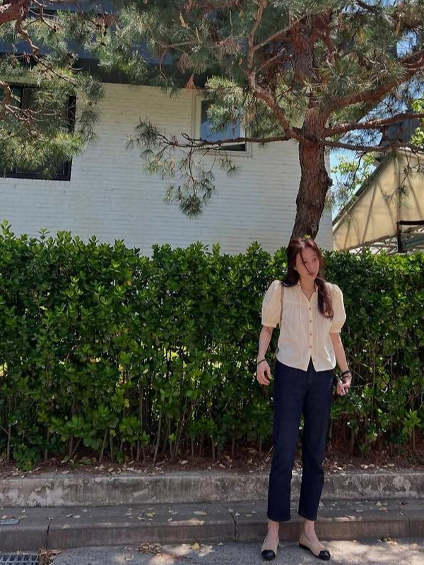 퍼프 소매가 포인트인 크림색 블라우스에 짙은 생지 데님 팬츠를 매치해 산뜻한 캐주얼룩을 완성했습니다.