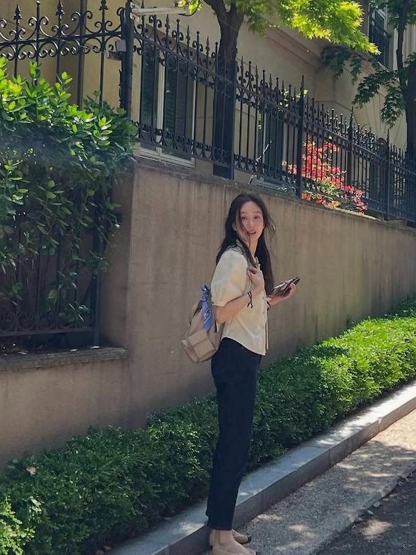 눈에 띄는 건 그녀의 백과 슈즈 선택으로 작은 사이즈의 베이지 백팩에 블루빛 스카프를 매듭처럼 묶어 감각적인 포인트를 더했고, 베이지 컬러의 플랫슈즈로 전체적인 룩에 통일감을 주었습니다.