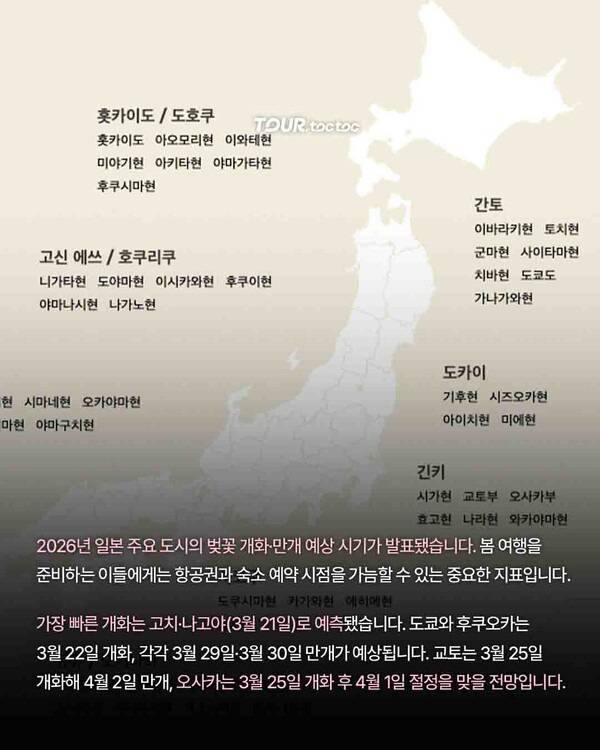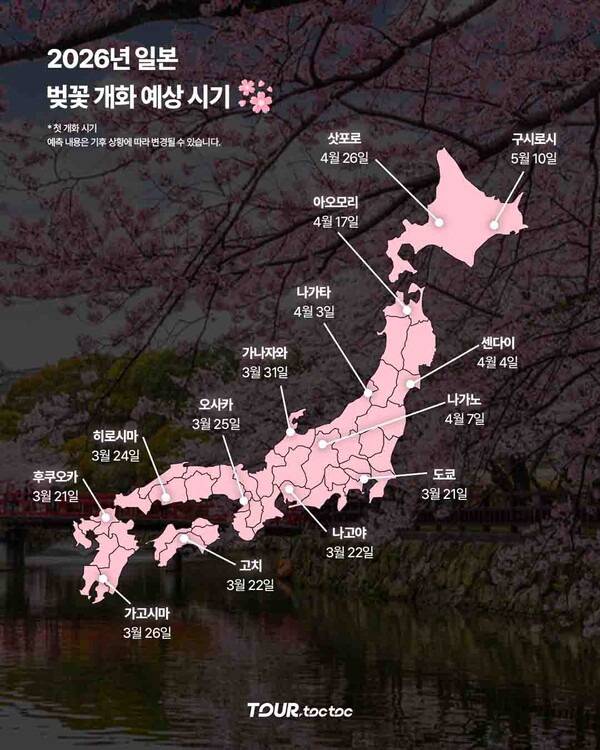 2026년 일본 주요 도시의 벚꽃 개화·만개 예상 시기가 발표됐습니다. 일본 정부 관광국에 따르면가장 빠른 개화는 고치·나고야(3월 21일)로 예측됐습니다. 도쿄와 후쿠오카는 3월 22일 개화, 각각 3월 29일·3월 30일 만개가 예상되는데요.