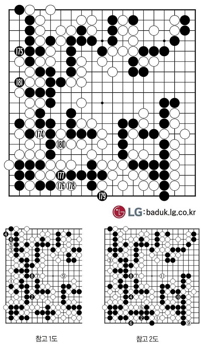 <제13보>(174~181)=신민준의 집중력이 흐트러지고 있다. 착각이나 실수가 나오지 않으면 무난한 국면에서 174도 멍한 수. 참고 1도 1이 정수였다. 그러면 3, 5는 백의 권리. 8까지 살려주고 9부터 착실히 끝내기를 하면 흑이 도저히 덤을 낼 수 없다.