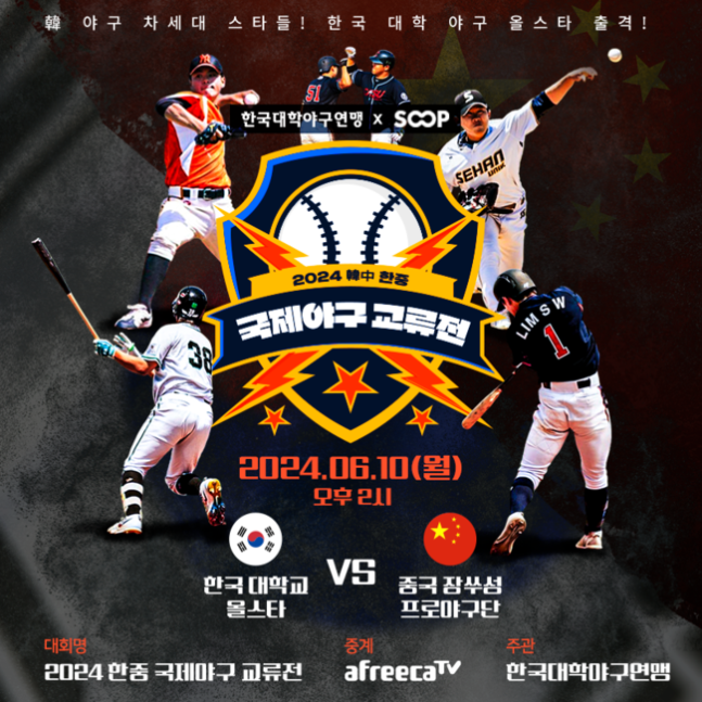 한국대학야구연맹이 주관하고, 아프리카 TV가 2연전을 생중계하는 이번 한중 국제야구 교류전은 세미프로로 진행되는 중국 야구팀의 기량 점검 및 국내 대학팀의 역랑 강화를 위해 진행된다. 원광대 손동일 감독이 올스타팀 지휘봉을 잡고 있으며, 경남대 신경헌 감독, 단국대 김유진 감독, 동강대 홍현우 감독, 한일장신대 이선우 감독으로 코치진을 구성했다. 지난 6일 진행된 대학 올스타팀과는 다르게 구성됐다.