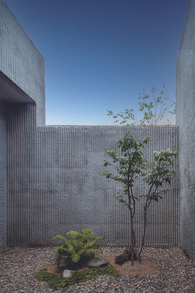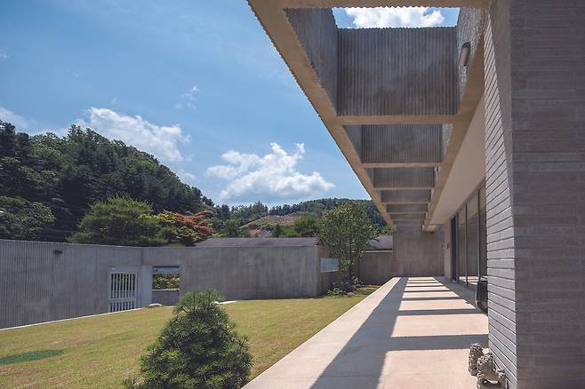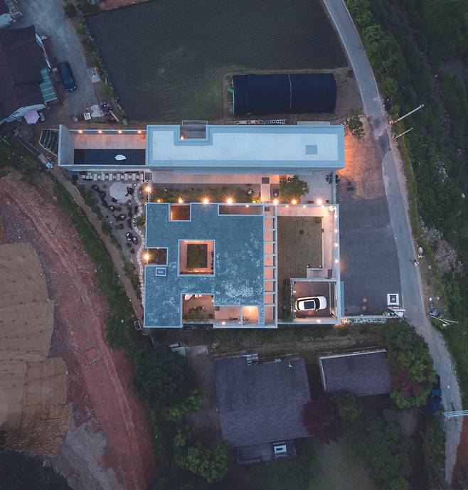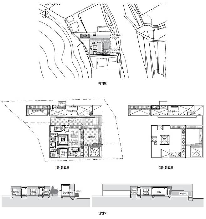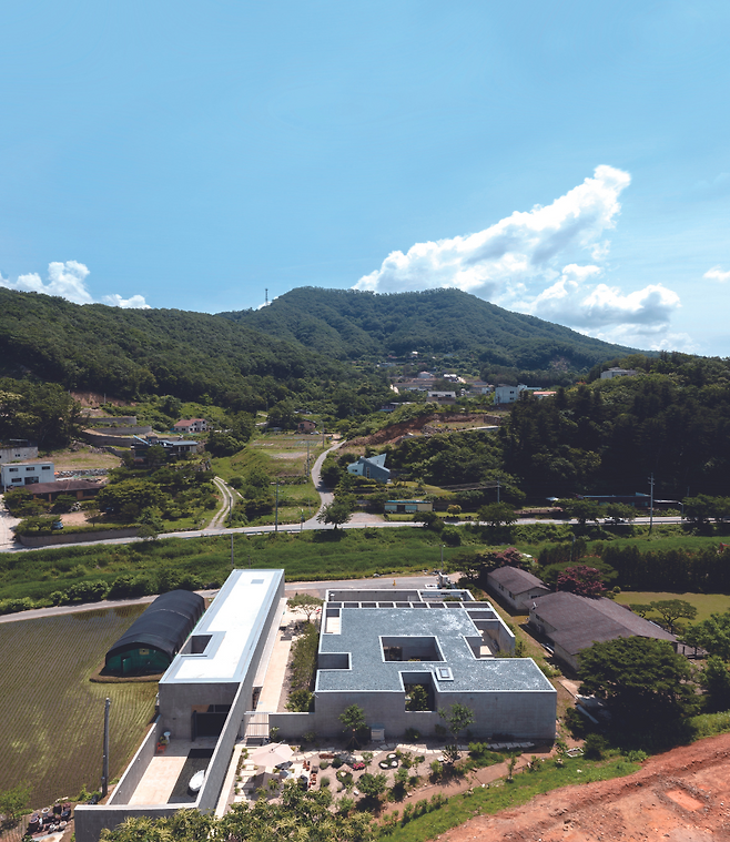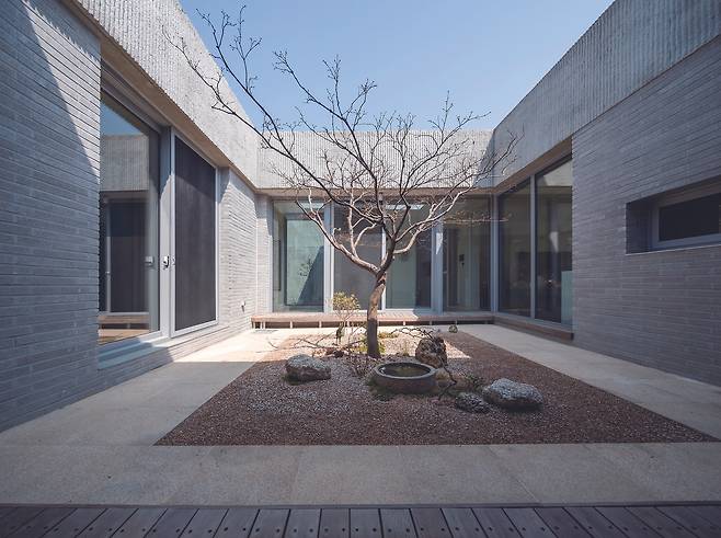 크게 주거동과 작업실동으로 나눴는데, 각 동은 프로그램에 따라 형태와 마당의 분화가 달라진다. 주거동은 ‘ㅁ’자, 작업실동은 ‘一’자 형태로 동쪽을 정면으로 바라보며 마당들과 함께 배치된다. 향과 조망, 프로그램의 상호 관계를 만들면서 7개의 마당이 형성된다. 이들 마당들은 열림과 닫힘, 분리와 연계, 부분과 집합의 관계를 만들면서 삶의 영역을 만들고 있다. 마당과 삶이 담긴 기하학은 삶의 공간이 내부에서 외부로, 외부에서 내부로 상호 작동하는 관계를 조직한다.