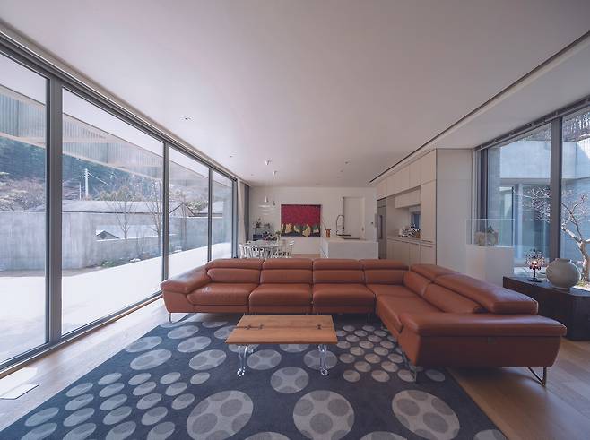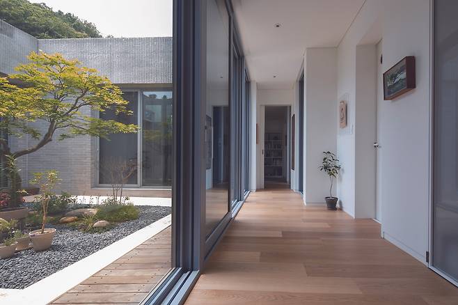 집 전체는 동쪽으로 주 좌향을 두고 있지만 각 실의 용도와 방향, 마당의 위치에 따라 풍경을 바라보는 방향이 바뀌게 된다. ‘ㅁ’자형의 주거동은 5개의 마당이 있다. 거실 앞 바깥마당은 동쪽 풍경을 끌어들이고 있다. 하지만 안방, 서재, 욕실과 짝을 이루는 마당들은 다른 방향성으로 경험된다. 가운데 중정은 집의 순환 동선에서 경험되는 마당으로 방향성 없이 중심성을 만들어 주고 있다.