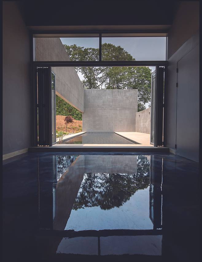 ‘一’자형의 긴 작업실동은 남쪽에 긴 마당을 두어 작업실에서 남쪽 마당 풍경을 바라볼 수 있다. 동시에 동쪽의 원경 풍경도 마당과 작업실에 끌어들여 중첩된 풍경으로 확장되고 있다. 작업실과 이어지는 서쪽 수변공간은 그 자체가 풍경이 되면서 주변 자연과 하나가 되고 있다.