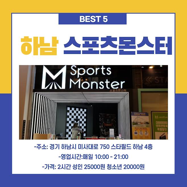 스타필드 하남에 위치한 스포츠 몬스터는 짜릿한 액티비티와 실내 스포츠를 동시에 즐길 수 있는 공간입니다. 실내 클라이밍, 트램펄린, VR 체험 등 다채로운 체험이 준비되어 있어 남녀노소 누구나 즐길 수 있습니다.