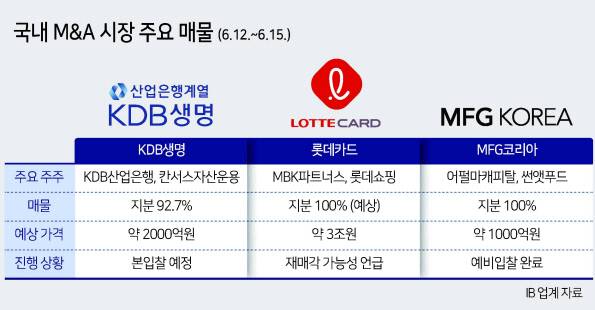 6월 셋째 주(12~16일) 국내 M&A 시장에서 KDB생명, 롯데카드, 매드포갈릭 운영사인 MFG코리아가 매물로 거론된다. 이들이 M&A 매물로 나온 것은 이번이 처음이 아니다. 과거 매각 작업이 좌초됐던 만큼 매물 가치를 입증해 새로운 주인을 찾을지 주목된다.