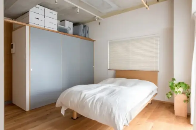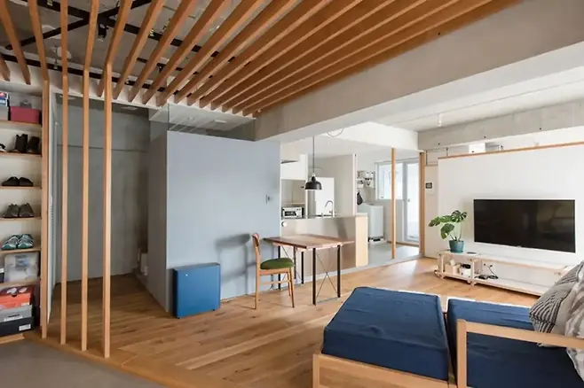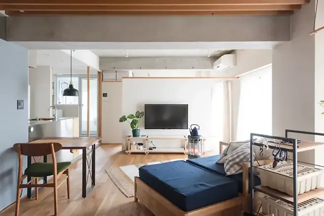 벽 뒤편에는 침대가 배치되어 사적인 공간과 공적인 공간 간의 구분을 명확히 하면서도, 전체 구조는 여전히 개방감을 유지한다.