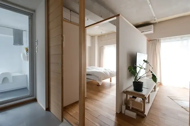 가장 과감한 변화는 욕실 위치의 재배치였다. 기존에는 창 없는 구석에 위치했던 욕실을 작은 창이 있는 벽 쪽으로 이동시켜, 실내 자연채광이 가능해졌다.