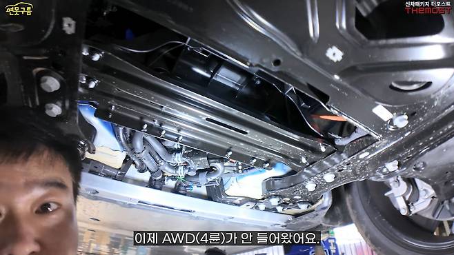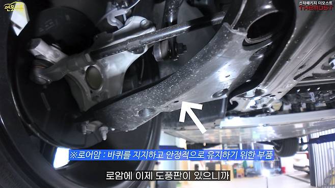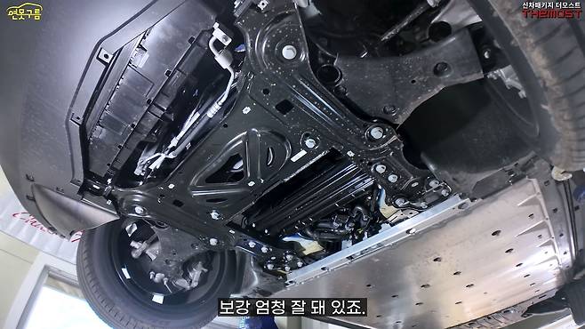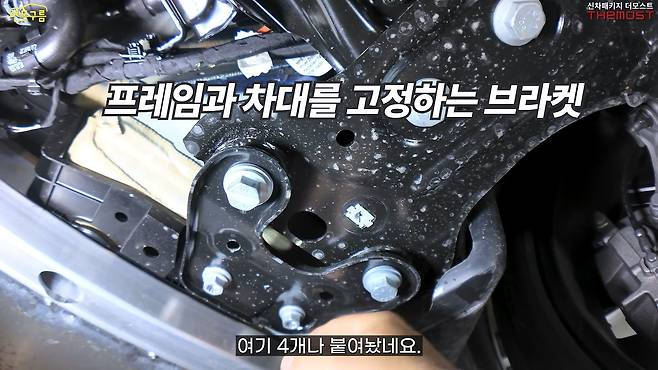 전륜 하체 구조를 살펴보니 크로스멤버의 사이즈가 굉장히 크고 보강이 아주 잘 되어 있다는 것을 확인할 수 있었습니다. 프레임에 연결되는 볼트 끝나는 부분에는 차대 보강재가 무려 네 개나 부착되어 있습니다.