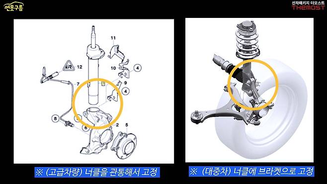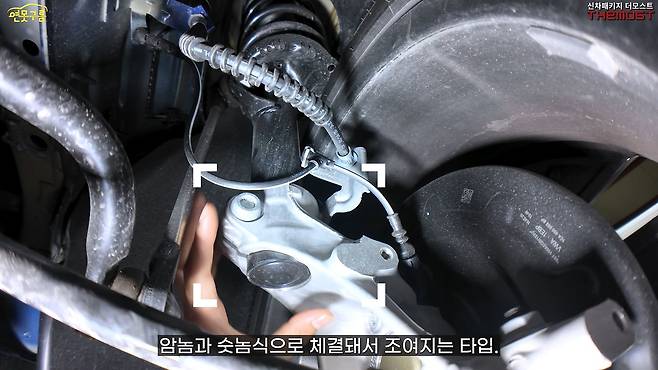 서스펜션 스트럿과 너클은 암수 방식으로 체결되어 조여지는 타입이었습니다. 이는 국내 제조사의 단순 체결 방식과 달리, 가운데를 통과하면서 안정적으로 조이는 느낌을 주었습니다. 국내차 중에서는 제네시스 GV70이 이 구조를 사용하고 있는 것으로 알고 있습니다. 로어암은 기가스틸 재질을 사용했고, 너클은 풀 알루미늄으로 제작되어 있었습니다.