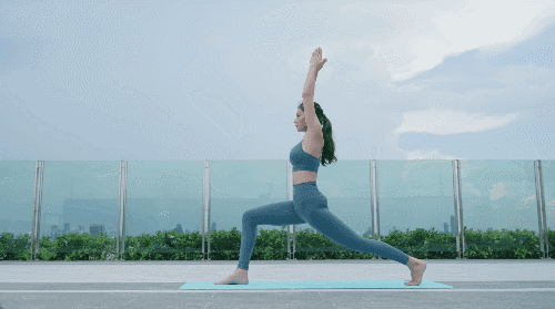 매트 위에 서서 오른발을 크게 앞으로 내딛고 손을 머리 위로 곧게 뻗습니다. 오른쪽 무릎을 약 90도로 구부리며 몸을 낮추되, 왼쪽 다리는 뒤로 뻗어 무릎이 굽혀지지 않도록 유지합니다. 상체를 세운 상태로 자세를 버틴 뒤 다리를 바꿔 같은 방식으로 진행합니다.