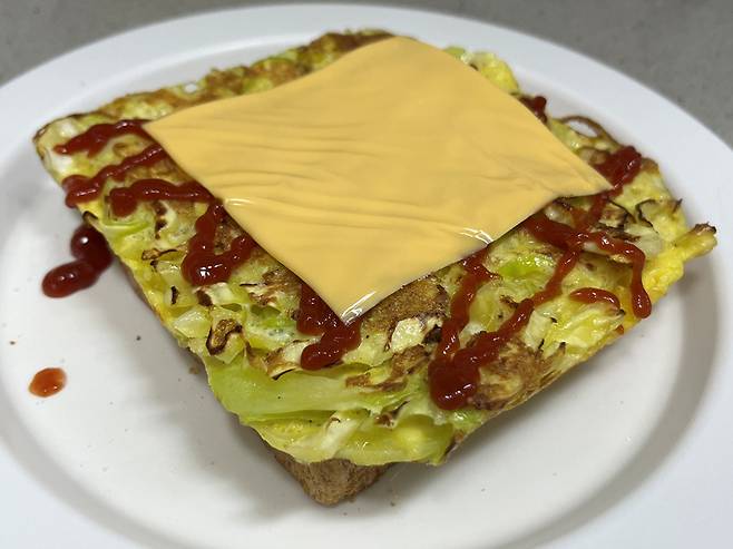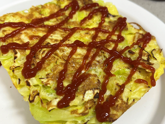 그 위에 양배추 구운 것을 올리고 케첩을 뿌려 주세요. 단 맛을 좋아하는 경우, 설탕을 이 위에 살짝 뿌리면 더 맛있게 먹을 수 있습니다.