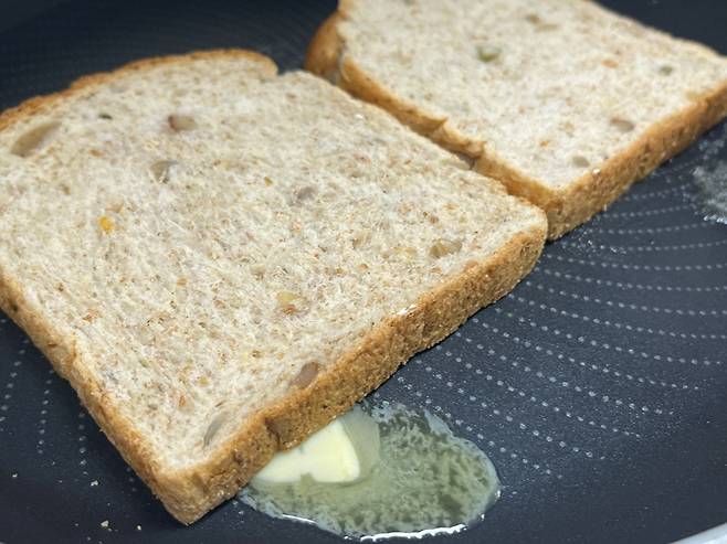 식빵은 버터를 녹여 굽습니다. 토스트를 만들 때 그냥 식빵을 굽는 것보다 이렇게 버터 향을 입히면 풍미가 더욱 살아나요.