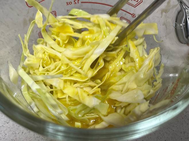 계란과 양배추를 섞어서 계란물이 양배추 사이사이에 스며들도록 해 주세요. 이대로 구워서 먹기만 해도 정말 맛있습니다. 오늘은 토스트를 해 볼게요!