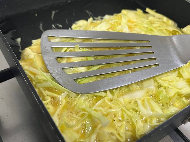 양배추 계란 반죽을 사각팬에 붓고 대략 식빵 크기로 모양을 잡아 줍니다. 뒤집개로 눌러서 빈틈을 매워 주세요. 아래쪽이 익으면 뒤집어서 위쪽도 익히세요.
