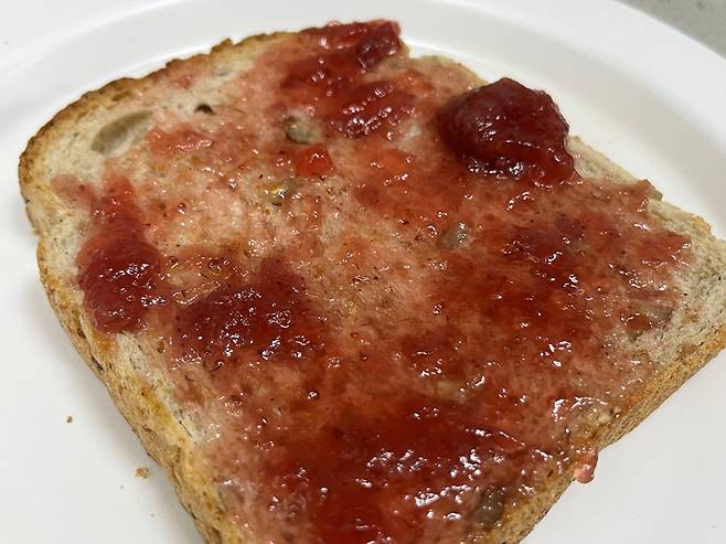 식빵 한 면에 딸기쨈 등을 발라 주세요. 단 것을 싫어한다면 쨈 대신에 마요네즈나 머스터드를 바르셔도 됩니다.