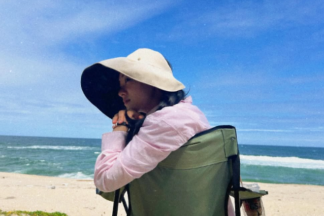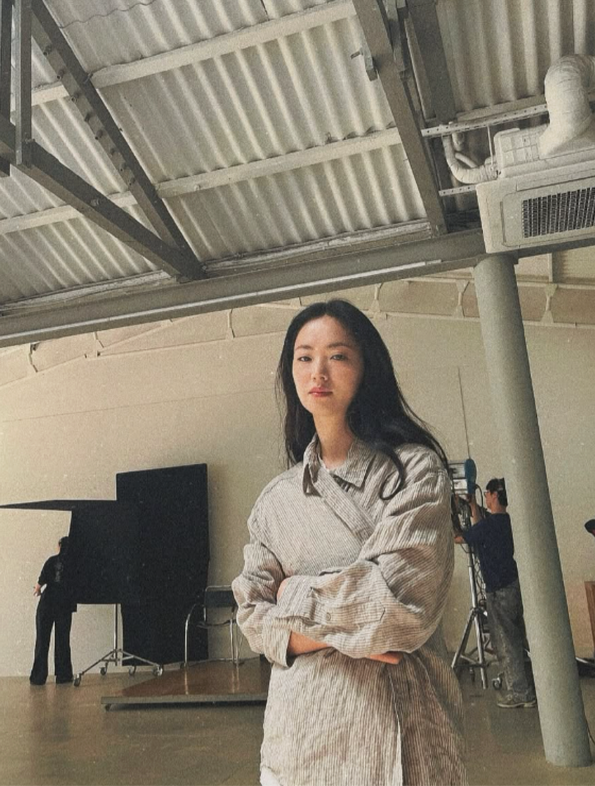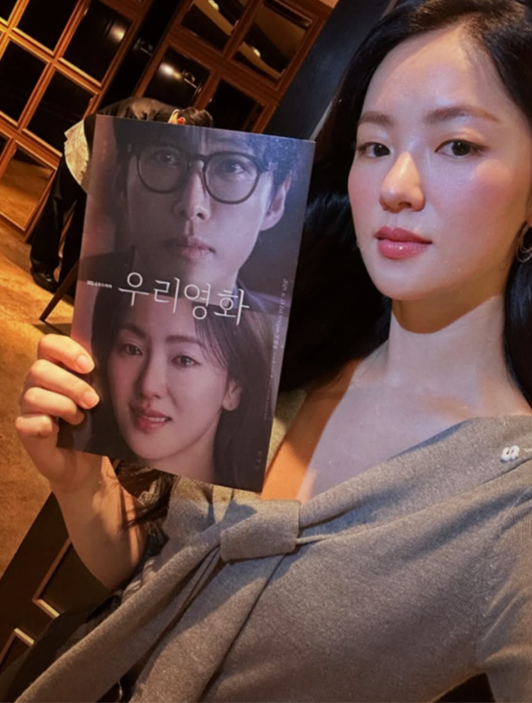 리본 디테일이 더해진 그레이 컬러 니트 상의는 그녀의 단정한 분위기와 자연스럽게 어우러졌고, 소프트한 웨이브 헤어와 깔끔한 후프 이어링으로 포인트를 더했다.