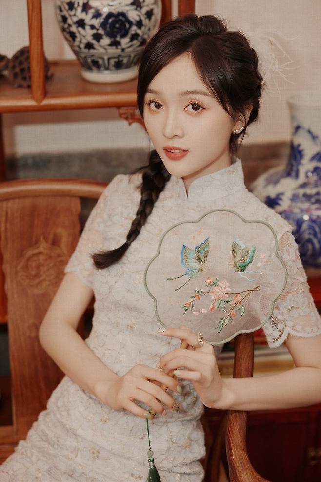 공개된 사진에서 선의는 레이스로 장식된 흰색 치파오를 입고 포즈를 취했다.