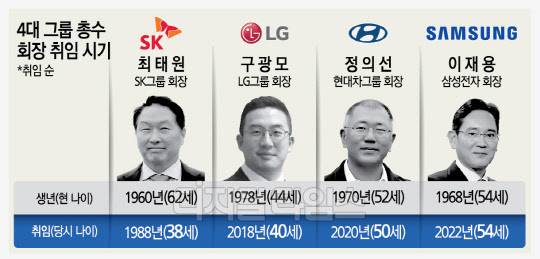 삼성전자 이사회가 27일 이 회장의 승진을 의결하면서 재계 1위인 삼성을 포함한 4대 그룹 총수들이 모두 회장직을 달았다. 현대차그룹은 2020년 10월에 1970년생 정의선 회장으로 20년 만에 총수를 교체하며 3세 경영을 시작했고, LG그룹은 1978년생인 구광모 회장이 2018년 6월 등기이사에 이름을 올리면서 동시에 취임했다. SK그룹의 경우 3세에 해당하는 최태원 회장이 1998년 취임해 24년째 그룹을 이끌고 있다. 그는 1960년생으로 4대 그룹 가운데 맞형 격이다.