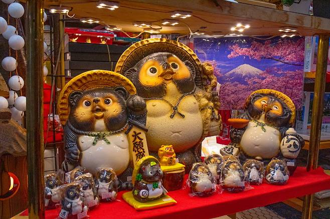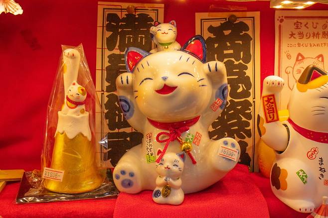 상품으로 특히 도자기, 플라스틱, 종이 등 재료를 달리해 만든 마네키네코가 많다. 저마다 표정과 생김새가 달라 다 데려가고 싶은 마음이 든다. 뱃살이 푸짐한 너구리 인형과 조그만 마메시바 인형도 시선을 사로잡는다. 이 외에도 연등, 풍경 등 다양한 일본 장식품도 판매하고 있다고.