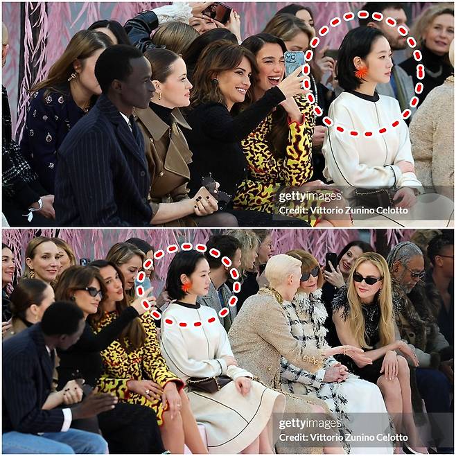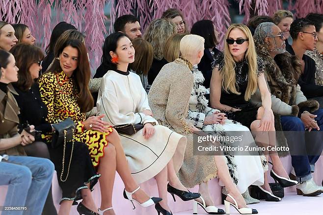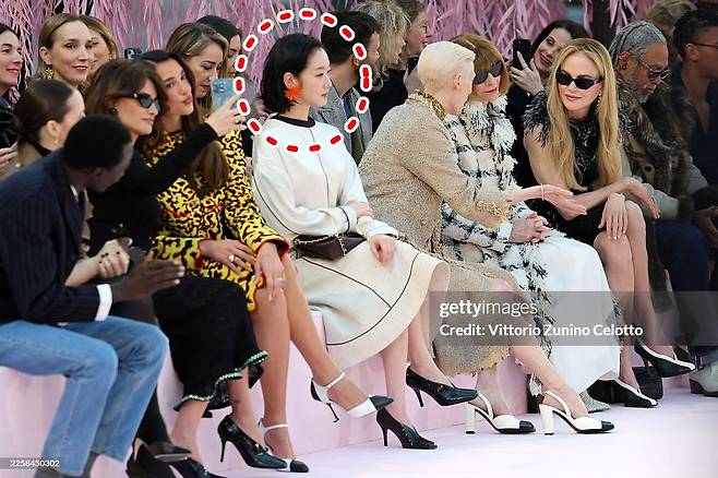 그 옆에 앉은 틸다 스윈튼은 소재와 실루엣, 태도 자체가 하나의 메시지처럼 작동하며 자연스럽게 중심을 형성했다. 같은 샤넬이었지만 시선의 흐름은 다르게 움직였다.