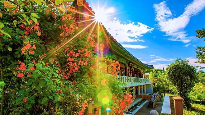 7월이 되면 절의 한편에서 능소화가 피어난다. 돌담을 따라 조용히 번져가는 주황빛 꽃은 화려하지 않지만 절의 분위기와 완벽하게 어우러진다.