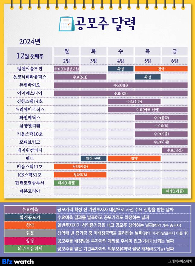 2024년 마지막 달에 들어서면서 올해 공모주 일정도 끝을 향해 달려가고 있어요. 12월 첫 주에는 수요예측이 11곳이나 기다리고 있어요. 공모주를 받기 위한 청약 일정도 3건이 있어요. '8800억 몸값' 엠앤씨솔루션 수요예측
