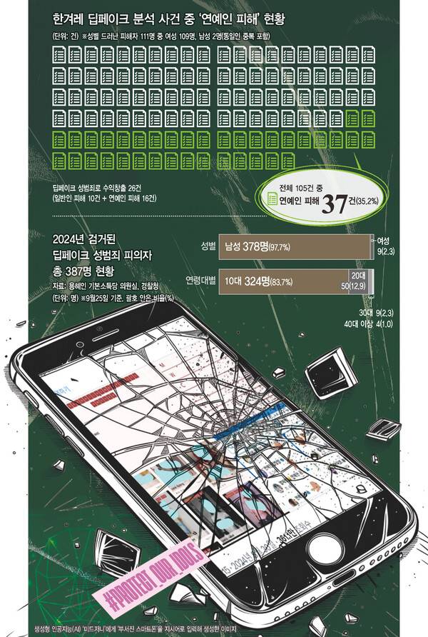 한겨레 젠더팀은 딥페이크 성범죄의 구체적인 양상을 파악하기 위해 성폭력범죄의 처벌 등에 관한 특례법 14조의2(허위영상물 반포 등)가 시행된 2020년 6월25일부터 올해 6월까지 해당 법 위반 혐의가 포함된 105건의 1·2심 판결문을 살폈다. 미성년자를 비롯한 거의 모든 여성 아이돌이 범죄에 무방비로 노출돼 있었다. 우리사회가 오랫동안 묵인한 피해다.
