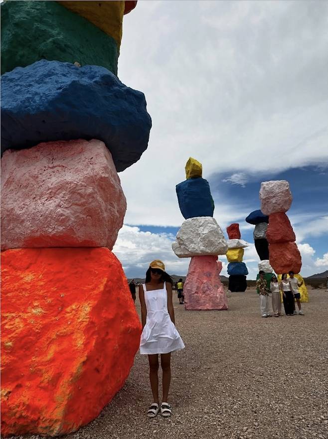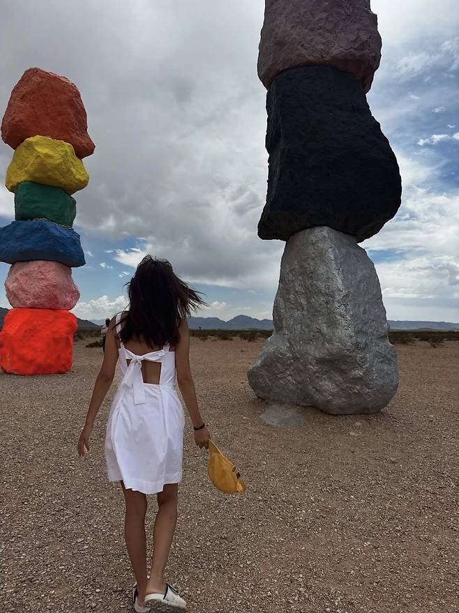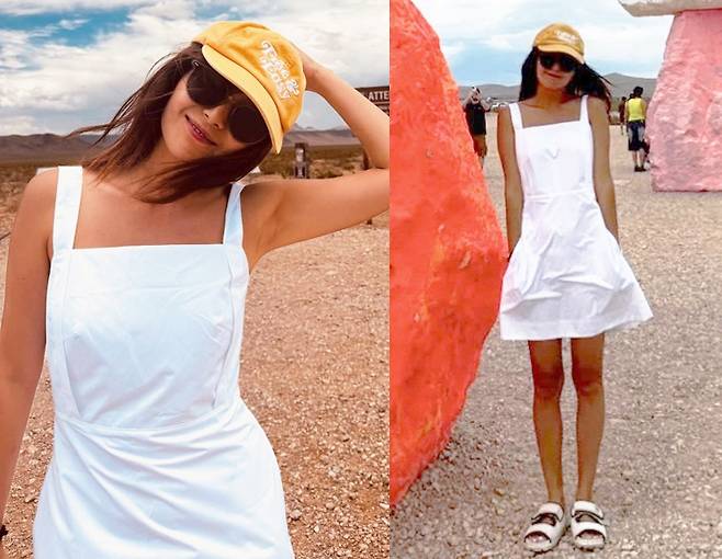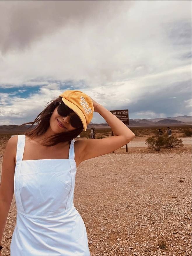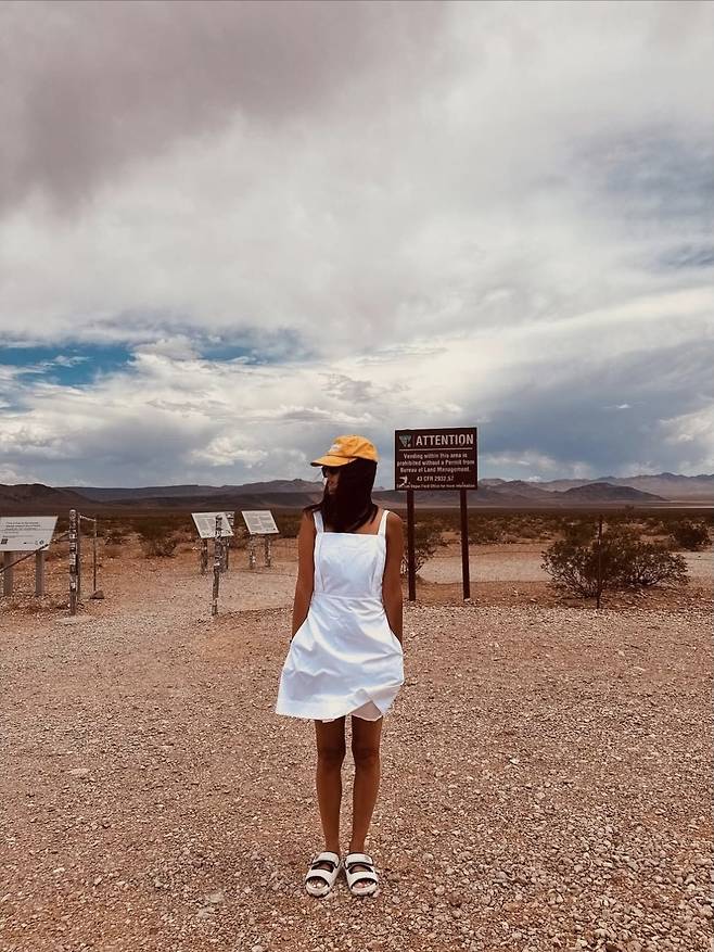 배우 이영은이 사막 한가운데서도 눈부신 화이트 원피스로 청량한 스타일을 완성했습니다.