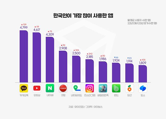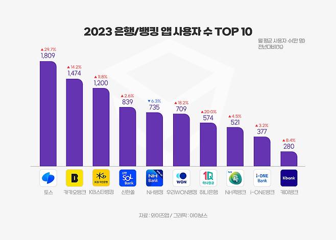 와이즈앱·리테일·굿즈에서 발표한 2023년 은행 앱 월평균 사용자수 자료를 보면 토스가 1809만 명을 기록해 전체 1위를 차지했어요. 카카오뱅크와 KB스타뱅킹도 넘어섰네요. 은행/뱅킹 앱뿐만 아니라 전체 앱 이용 순위에서도 두각을 나타냈습니다. 2023년 한국인이 가장 많이 사용한 앱 10위에 랭크된 것이죠. 충분히 앱 사용자를 확보한 토스는 광고 사업을 준비하기 시작했습니다.