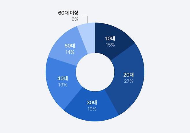 - 토스의 이용자 연령층은 10대부터 60대까지 다양하게 구성되어 있습니다. 특히 2030 세대가 주력으로 이용하고 있는데요. 20대 가입자의 수는 564만 명으로 우리나라 전체 20대 인구의 90%가 이용하는 것입니다. 30대는 전체 30대 인구의 80%이고, 40대는 68%가 이용 중이라고 합니다.