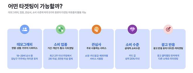 - 타기팅은 연령, 성별, 거주지 등 인구통계학적 정보와 소비 업종, 관심사, 소비 수준, 그리고 광고 반응으로 설정할 수 있습니다.