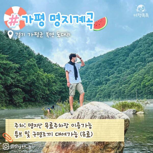 명지계곡은 수심이 깊은 곳도 있어 어린아이와 방문 시 구명조끼를 필수로 준비하는 것을 권장합니다. 주변 상점들에서 보증금 5000원+대여료 5000원에 튜브 또는 구명조끼 대여도 가능합니다. 특히, 가평 명지계곡은 취사가 가능하고 애견동반도 가능합니다.