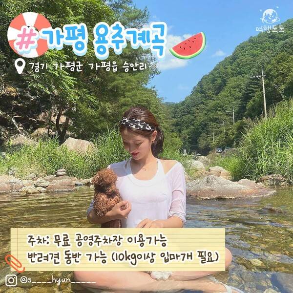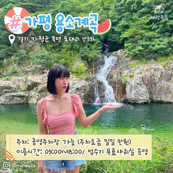 가평 용추계곡 주차장은 여러 곳이 있지만 '가평군 가평읍 승안리 639-1'을 찍고 방문하면 제일 넓은 무료 주차장과 함께 화장실 이용이 가능합니다. 또한 뒤편으로 계곡 가는 길이 바로 이어져 물놀이가 가능합니다. 용추계곡에는 샤워시설은 없습니다. 계곡 내 취사는 안되니 도시락이나 간단한 먹거리를 챙기거나 인근 맛집에서 식사하세요!