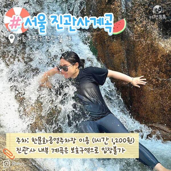 진관사 내부 계곡은 특별보호구역으로 출입이 제한되어 위반 시 과태료를 낼 수 있습니다. 진관사 계곡에서 물놀이를 즐기고 싶다면 진관사 무료주차장 아래 마실 길 근린공원 근처 구역을 이용해 주세요. 주차는 은평한옥마을 한문화공영주차장에 가능하며 주차비는 5분에 100원으로 1시간 주차 시 1,200원으로 저렴하게 이용할 수 있습니다.