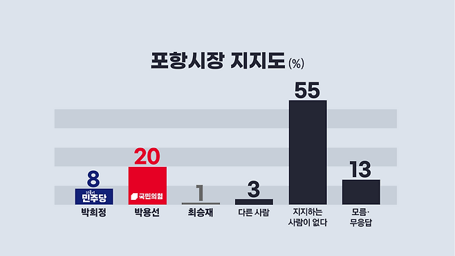 여론조사 결과는 민주당 박희정 후보 8%, 국민의힘 박용선 후보 20%, 무소속 최승재 후보 1%로 조사됐습니다.