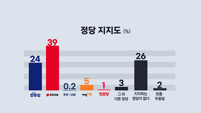 정당 지지도는 더불어민주당 24%, 국민의힘 39%, 개혁신당 5% 등으로 조사됐습니다. 박희정, 박용선 두 후보 모두 정당 지지도에 크게 못 미치는 지지율을 보였습니다.