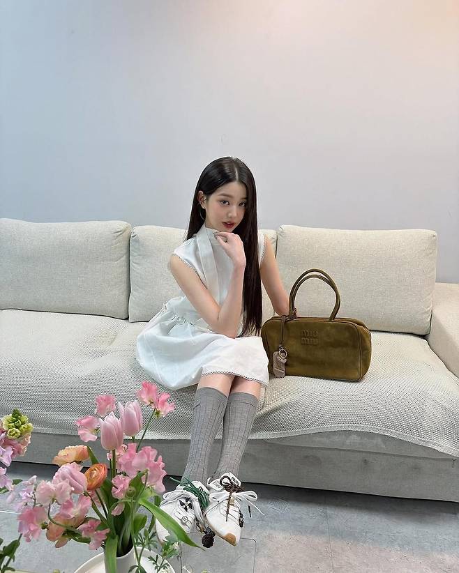 무릎 아래까지 올라오는 회색 니삭스와 매듭이 독특한 미우미우 스니커즈가 이 룩의 하이라이트다. 자칫 단조로울 수 있는 화이트 원피스에 캐주얼한 무드를 더하고, 봄날 교복처럼 아련한 정서를 자아낸다. 미니멀하면서도 감각적인 이 조합은 그녀가 스타일링에 있어 얼마나 세심한 감각을 지니고 있는지를 보여준다.