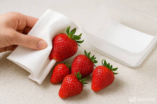 씻은 딸기를 그대로 두면 수분이 남아 금방 상한다. 키친타월로 겉면을 눌러 닦아주는 게 좋다. 용기에 담을 땐 바닥에 키친타월을 깔아 수분이 아래 고이지 않게 해야 한다. 그래야 과육이 무르지 않는다.
