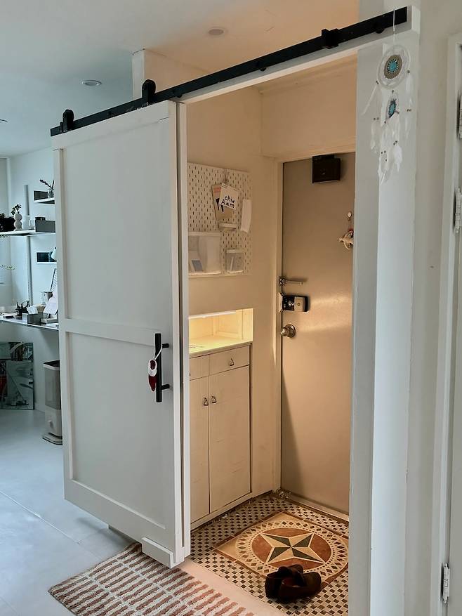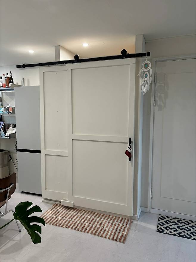 짠! 이 중문은 이렇게 탈바꿈합니다. 내부 벽에 칠했던 페인트를 동일하게 발라 문이 아니라 벽과 같은 느낌을 주었습니다. 다른 컬러로 재미를 더하는 것도 좋았겠지만, 통일성을 주니 훨씬 넓어 보였어요.