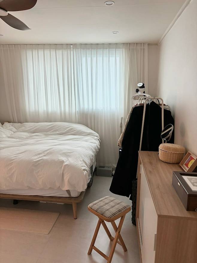 외출을 준비할 때 전신 거울을 보며 옷을 입고, 수납장 앞 의자에 앉아 화장을 해요. 이 귀여운 의자는 친한 언니에게 받아온 빈티지 체어예요. 체크 패턴이 마음에 들어 냉큼 가지고 왔습니다. 후후. 침대 밑 작은 박스가 보이시나요? 역시나 수납을 위한 수납박스가 두 개나 들어가 있답니다.