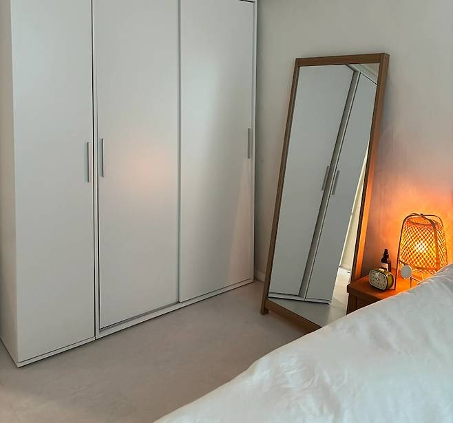 안방은 최대한 심플하게 꾸몄습니다. 우드톤과 베이지톤을 넣어 따뜻함을 주려고 했어요. 침대의 중요성을 깨달았기 때문에 오로지 침대를 위한 방으로 만들었죠. 그날의 질을 결정하는 건 좋은 수면이라고 생각해요. 여러분, 기억하세요. 잠이 최고입니다.